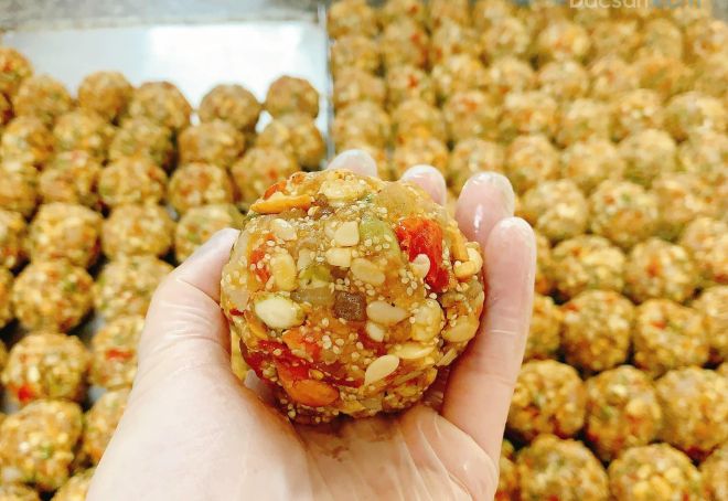 - Trộn đều, thêm rượu mai quế lộ rồi vo viên. Phần nhân mỗi viên khoảng 65g Sau đó, cho trứng muối vào giữa.
