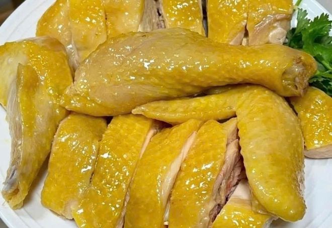 Thành phẩm: Gà da vàng óng, thịt ngọt mềm, giữ trọn hương vị nguyên chất, ăn kèm chén nước luộc gà siêu dính.
