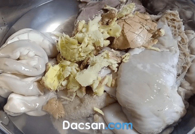 Lá lách, ong bò và dạ dày trần sơ qua với nước gừng đun sôi. Trong lúc trần nếu nỏi bọt thì dùng muỗng hớt bỏ bọt. Trần trong khoảng 5 phút và rửa sạch lại với nước rồi để ráo.