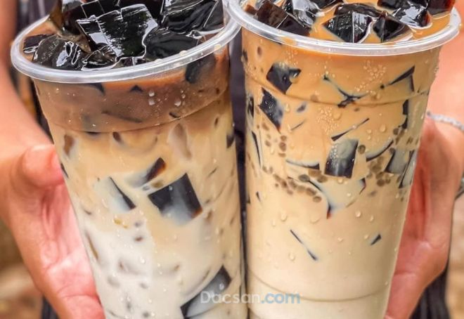 Ly cà phê sữa tươi sương sáo là sự kết hợp hài hòa của vị béo của sữa, vị mát của sương sáo, chút đắng nhẹ của cà phê. Uống là dính lắm luôn á!