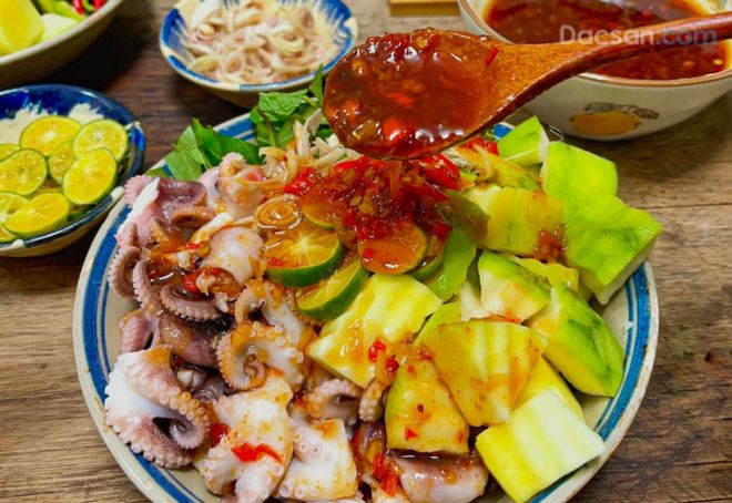 - Cho vào tô trộn gồm có bạch tuộc, xoài cóc, rau thơm, sả tắc xắt mỏng, thêm ớt xắt lát (tuỳ thích). Rưới nước sốt thái vào và trộn đều, để 10-15' cho ngấm gia vị là có thể thưởng thức.