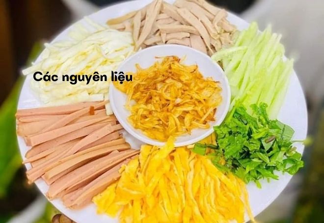 Các topping: trứng, xúc xích, giò, dưa leo, hành khô, chanh, rau thơm