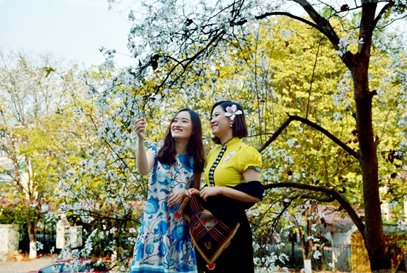 Các thiếu nữ xinh đẹp bên hoa ban Tây Bắc đang nở rộ