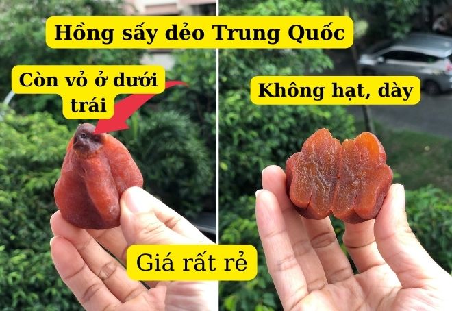 Hồng sấy dẻo Trung Quốc cứng hơn. Quả đều, bên trong không hạt. Phần cuối trái vẫn còn chút vỏ. Vị ngọt lợ, có thể có chút vị chát. Để lâu cứng.