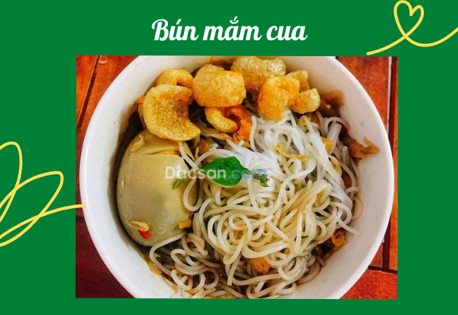 Gây tò mò với du khách nhất là bún mắm cua vì bún này còn có cách gọi khác là bún cua thúi. Loại nước lèo nấu bún mắm cua có sử dụng một loại nước mắm ủ từ cua đồng. Mùi vị khá đặc trưng nhưng cuốn hút. Bún mắm của có thêm heo chiên giòn, thịt ba rọi, chả nem, bánh phồng tôm. Đừng e dè mùi vị mà bỏ lỡ việc thưởng thức món này vì ngay sau đó, vị giác của bạn sẽ bị chinh phục ngay.