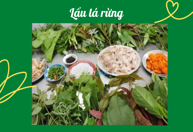 Lẩu lá rừng là một loại lẩu với nguyên liệu chính là các loại lá rừng. Nước dùng nhúng lẩu được hầm thì thịt, ngọt béo. Bên cạnh đó còn có thịt nướng, nem chua để nhúng vào nồi nước dùng ăn trực tiếp cũng rất ngon.