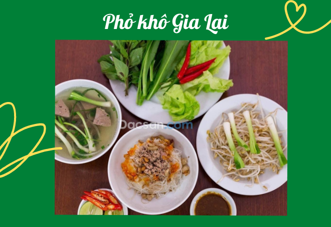 Phở khô hay còn gọi là phở hai tô. Nghĩa là một phần ăn sẽ bao gồm hai tô: một tô đựng phở và một tô đựng nước lèo. Sợi phở khô Gia Lai làm từ bột gạo, sợi nhỏ, mềm, dai. Trong tô bánh phở sẽ có thêm thịt gà xé, thịt bò bắp, gân bò hoặc thịt heo bằm, rồi bò viên. Thêm hành phi thơm. Nước lèo đậm đà do ninh từ gà hoặc bò tùy theo bí quyết chủ cửa hàng chọn.