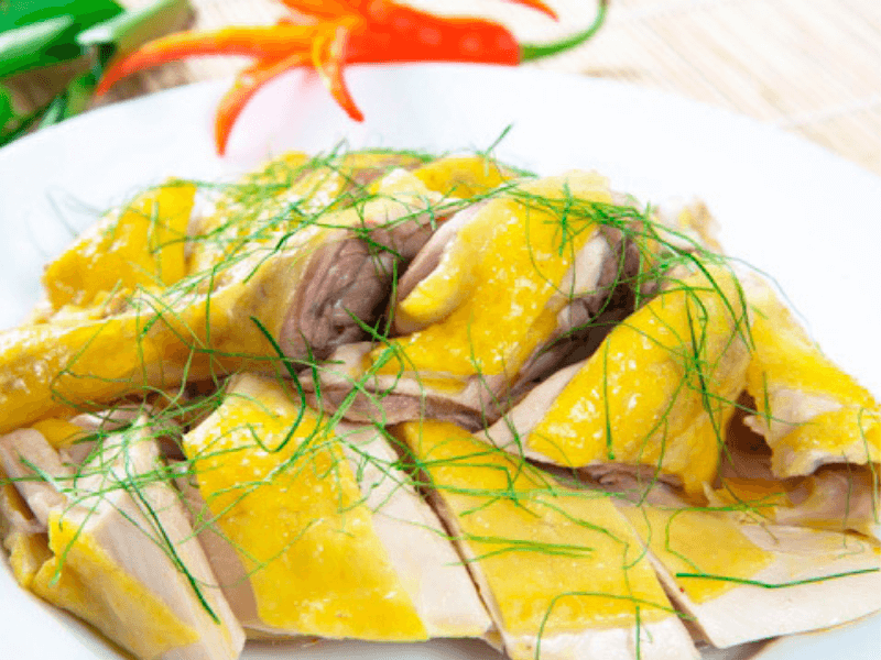 Vậy mà khi nấu xong gà có màu vàng ươm như bôi nghệ, lớp da bóng bẩy, da dày và giòn khi ăn các thớ thịt chắc mềm tứa ra vị ngọt tự nhiên. Gà không hề có mùi khó chịu mà lại thơm nhẹ nhàng khiến thực khách phải gật gù liên tục, và để tăng hương vị thì bạn hãy chấm miếng thịt gà với bát muối tiêu chanh.