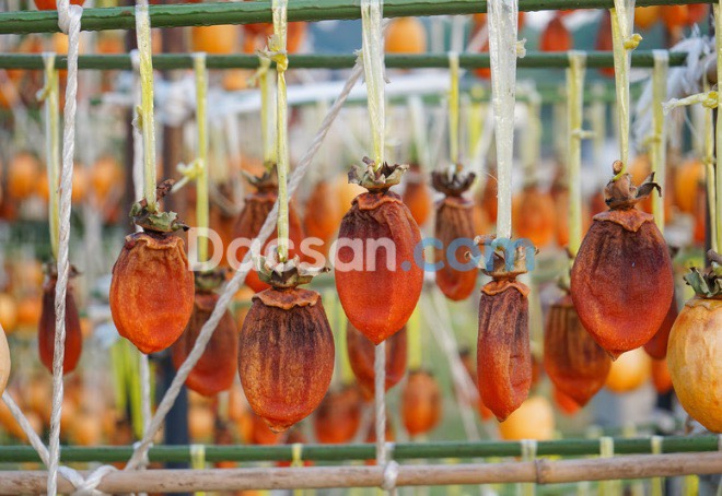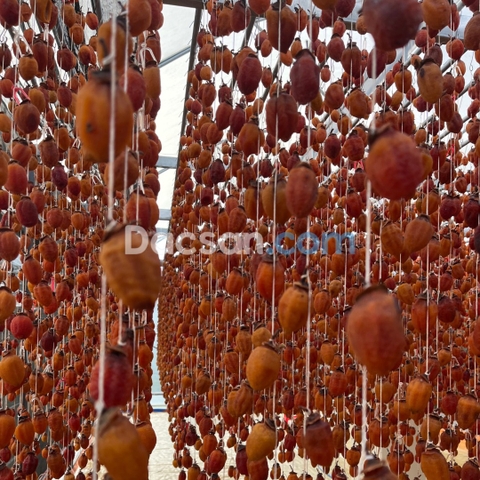 Sau đó, hồng sẽ được sấy khô ở nhiệt độ 500 - 600 độ C trong vòng ba giờ đồng hồ. Công đoạn tiếp theo là người làm hồng sẽ treo chúng trên dây, sắp xếp so le để các trái không chạm vào nhau rồi tiếp tục được phơi gió trời theo công nghệ Nhật Bản trong vòng 28- 30 ngày, không qua tẩm ướp hóa chất bảo quản.