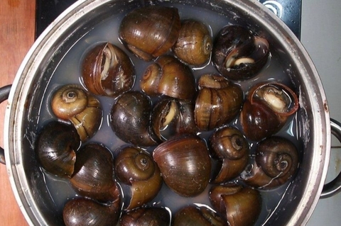 Luộc ốc bằng lửa to đến khi sôi bùng thì tắt bếp, đảo cho ốc bong vảy. Đợi ốc nguội thì lấy phần thịt ốc ra, lưu ý là chỉ lấy phần thịt miệng ốc.