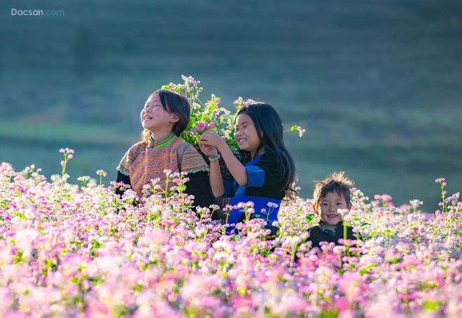 Trên đường vào Làng văn hóa Lũng Cẩm – Thung lũng Sủng Là hay dưới chân đèo Mã Pì Lèng, du khách sẽ có cơ hội thu vào ống kính của mình những tấm hình tuyệt đẹp có một không hai với background là thảm hoa rực rỡ mọc thênh thang trên sườn đồi và ruộng bậc thang. Đôi khi, bạn sẽ bắt gặp những cây hoa mạnh mẽ vươn lên từ khe đá tai mèo nhọn hoắt hoặc lấp ló bên hàng hiên trước nhà. Rồi hình ảnh những em bé cười hồn nhiên bên hoa trong ánh nắng ban mai buổi sớm quá đỗi tinh khôi...