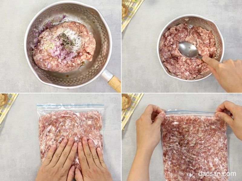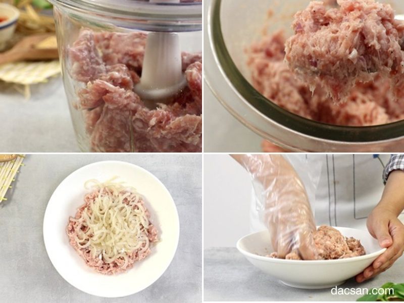Trộn phần thịt heo đã xay cùng bì heo thật đều. Cho thêm muối, đường, nước mắm, bột năng, thính, hạt điều, tỏi, ớt vào thịt rồi trộn đều lên lần nữa.