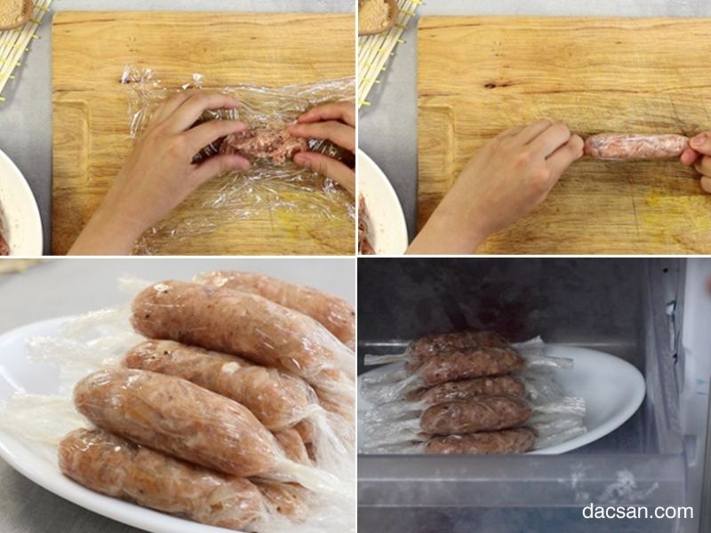 Múc hỗn hợp nem chua vừa đủ đặt lên miếng giấy bọc thức ăn. Sau đó dùng tay nặn thành hình thuôn dài, rồi cuốn giấy bọc thức ăn lại. Tiếp đến, xoắn hai đầu nem lại cho chắc.