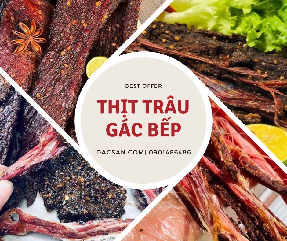 Thịt trâu gác bếp được làm từ nguyên liệu thịt tươi sạch tuyển chọn phần ngon nhất cùng phương thức chế biến cầu kỳ là một đặc sản Tây Bắc thường được người dân bản địa dùng để chiêu đãi khách quý tới thăm nhà. Ngày nay, món ngon này đã được sử dụng rộng rãi trong cuộc sống thường ngày, các dịp lễ tết hoặc làm quà tặng trân quý.